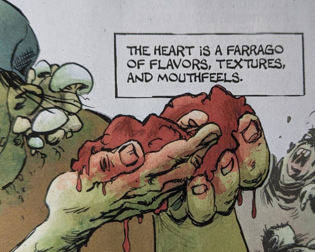 After the apocalypse, zombies are the dominant species. The story follows one horde that’s formed its own little society. The narrator (a zombie) gets super graphic about eating a human heart right at the start — and it’s not just gross-out stuff; it actually sets up the whole tone. Deniz Camp is cooking with this world-building.