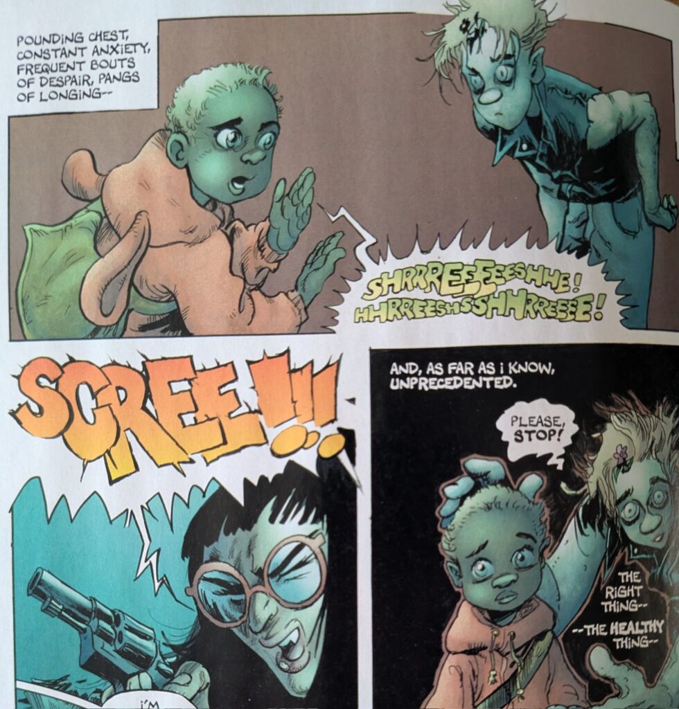 The story continues with our main zombie character and the human mom and daughter from the previous issue. We learn that zombies literally can’t understand humans — to them it just sounds like screeching. There’s even a little zombie council meeting where they debate whether humans have higher thought at all.