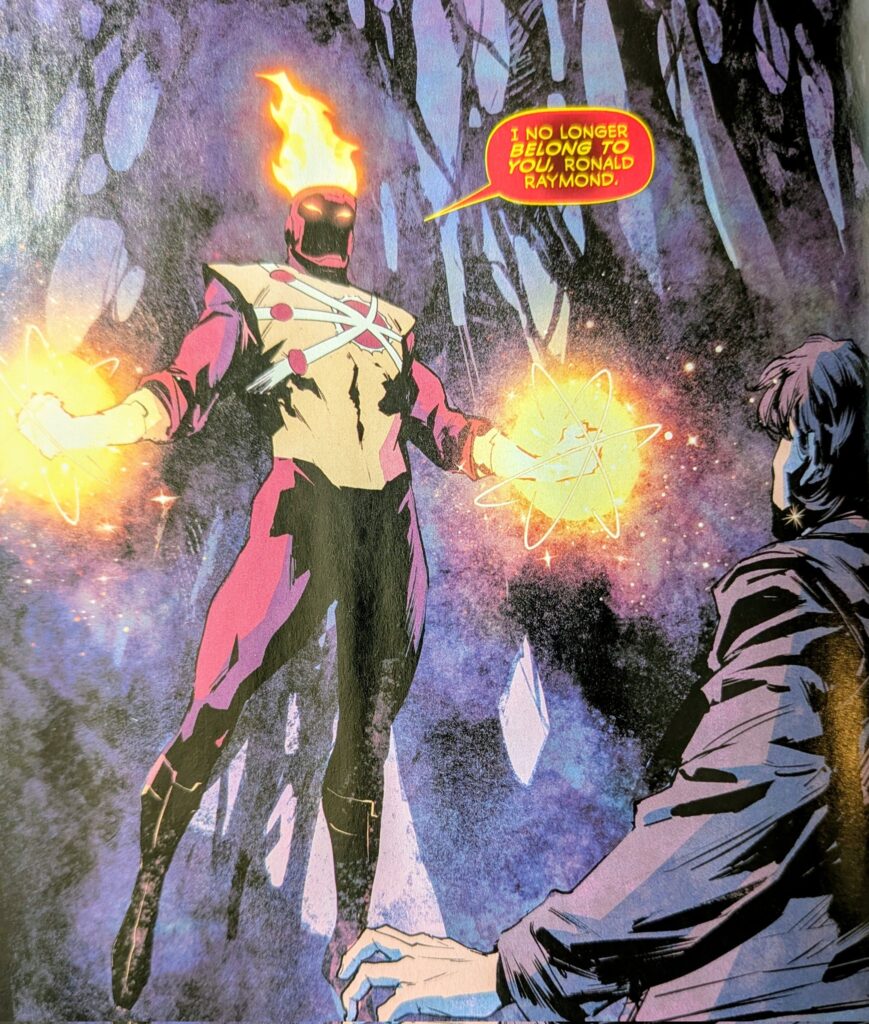 - Firehawk basically admits they can’t stop him alone and realizes they need to find Dr. Martin Stein, who knows Ronald best.